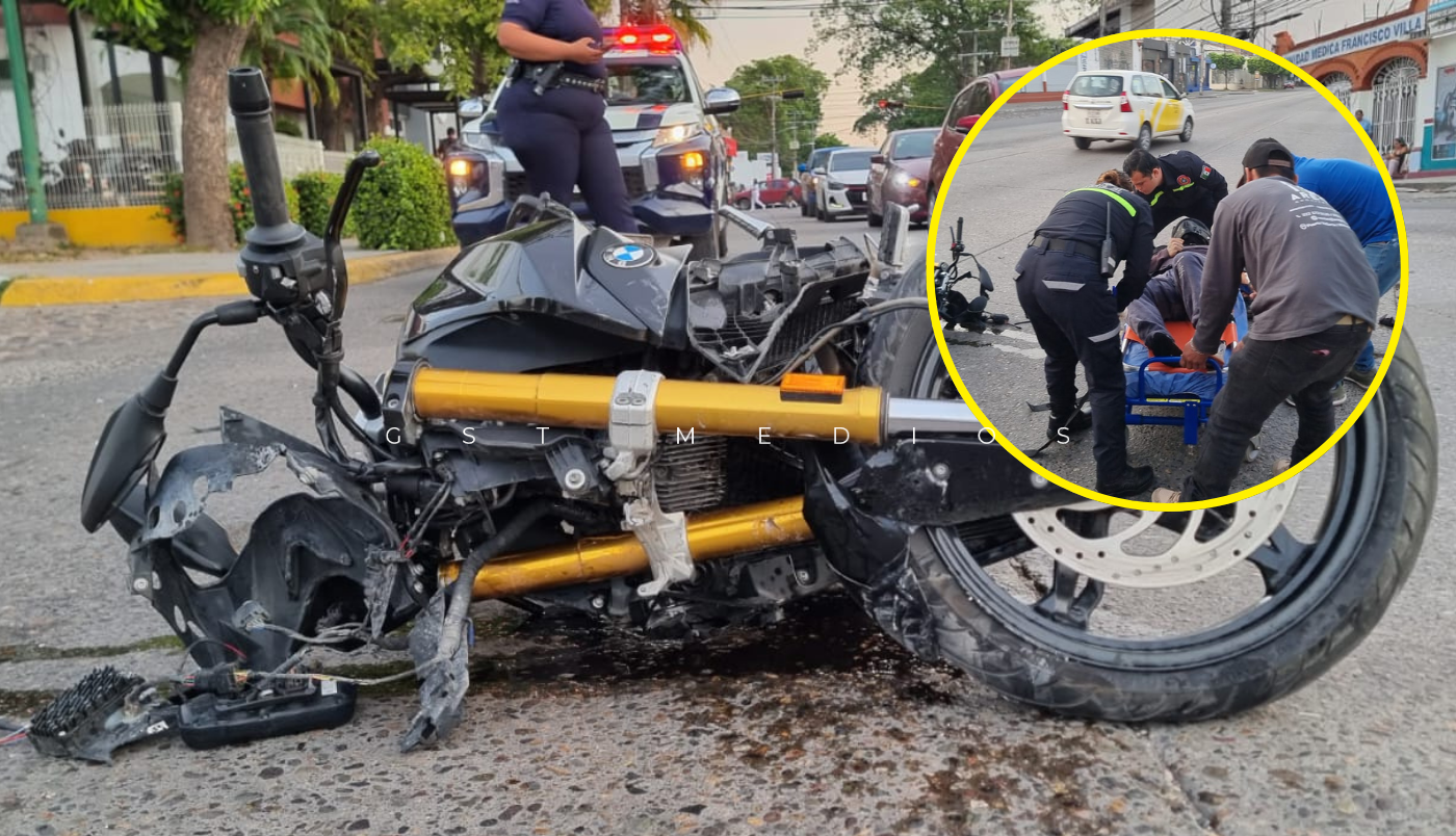 El joven viajaba en una motocicleta BMW cuando una camioneta le cortó el paso en el cruce de Francisco Villa y Milán, dejando al motociclista con fractura expuesta en el brazo.