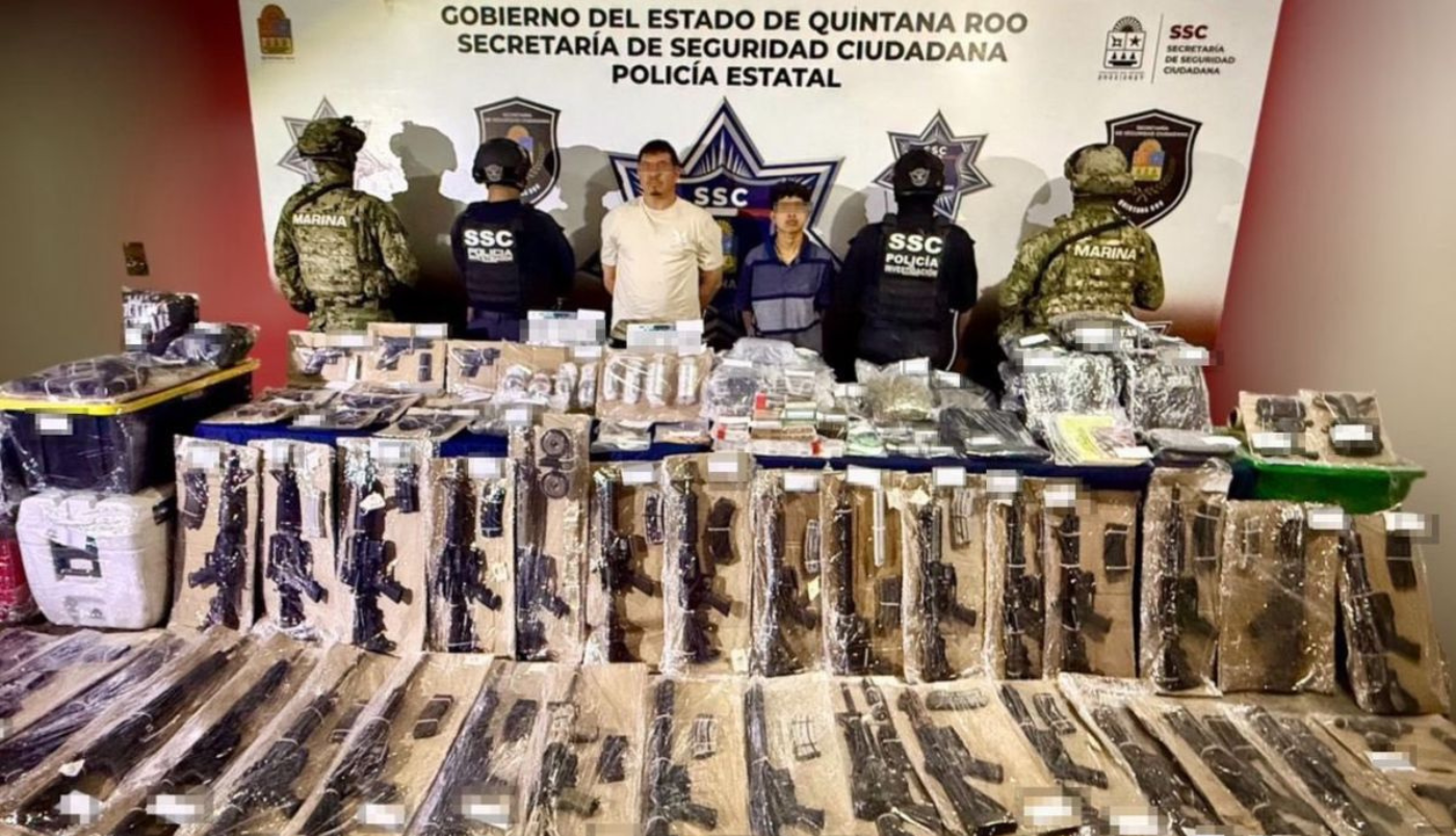 Marcos Josué “N” y Ángel Roberto “N”, alias “El Flaco” fueron detenidos en Quintana Roo; se les aseguraron una gran cantidad de armas largas, granadas, drones, drogas y vehículo vinculados a actividades criminales.