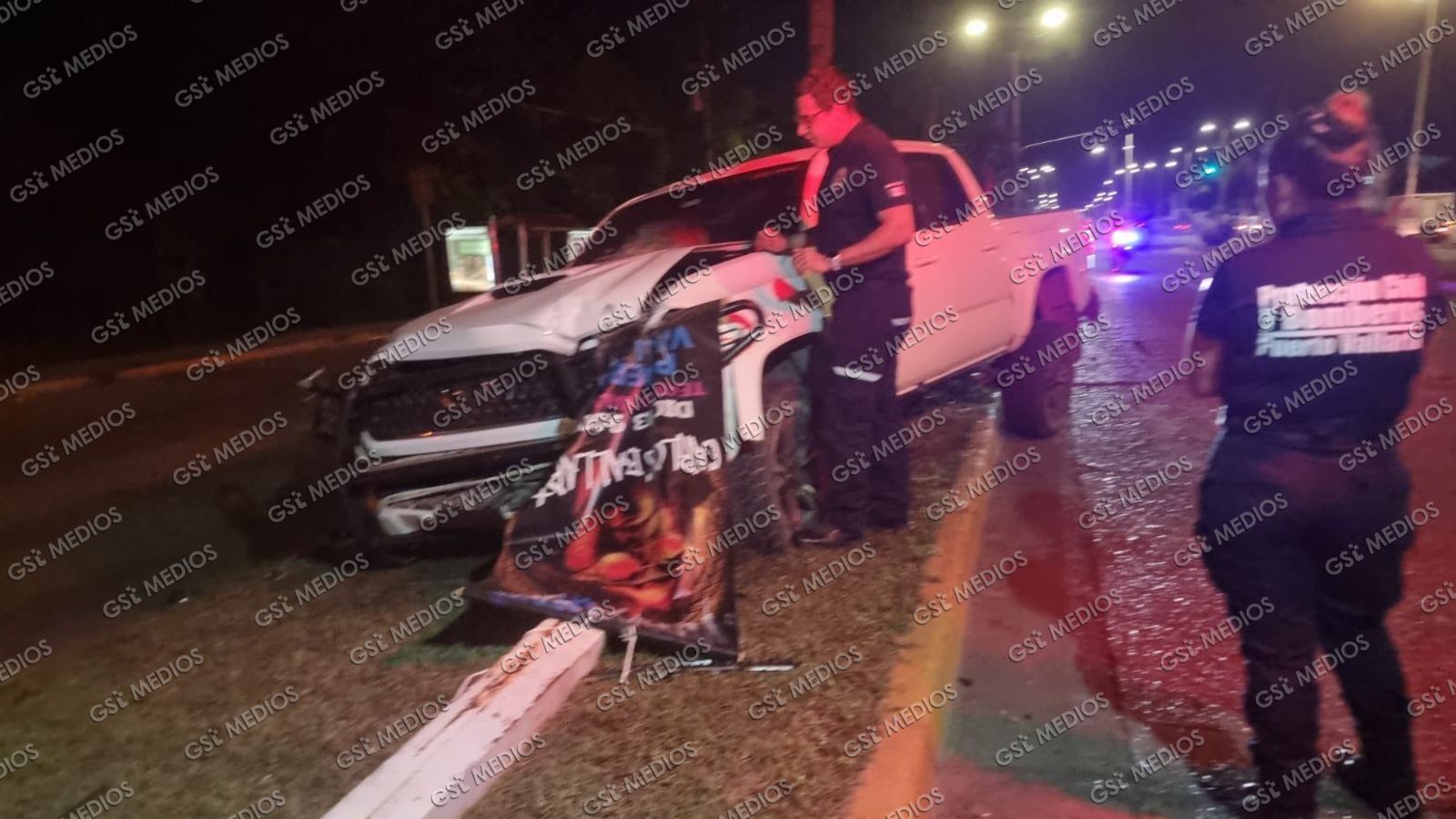 La mañana de este lunes se registró un fuerte percance vial sobre la avenida Medina Ascencio a la altura de la Marina Los Peines, luego de que el conductor de una camioneta Toyota Tacoma terminara impactando contra una lámpara y varias palmeras del camellón de los carriles centrales.