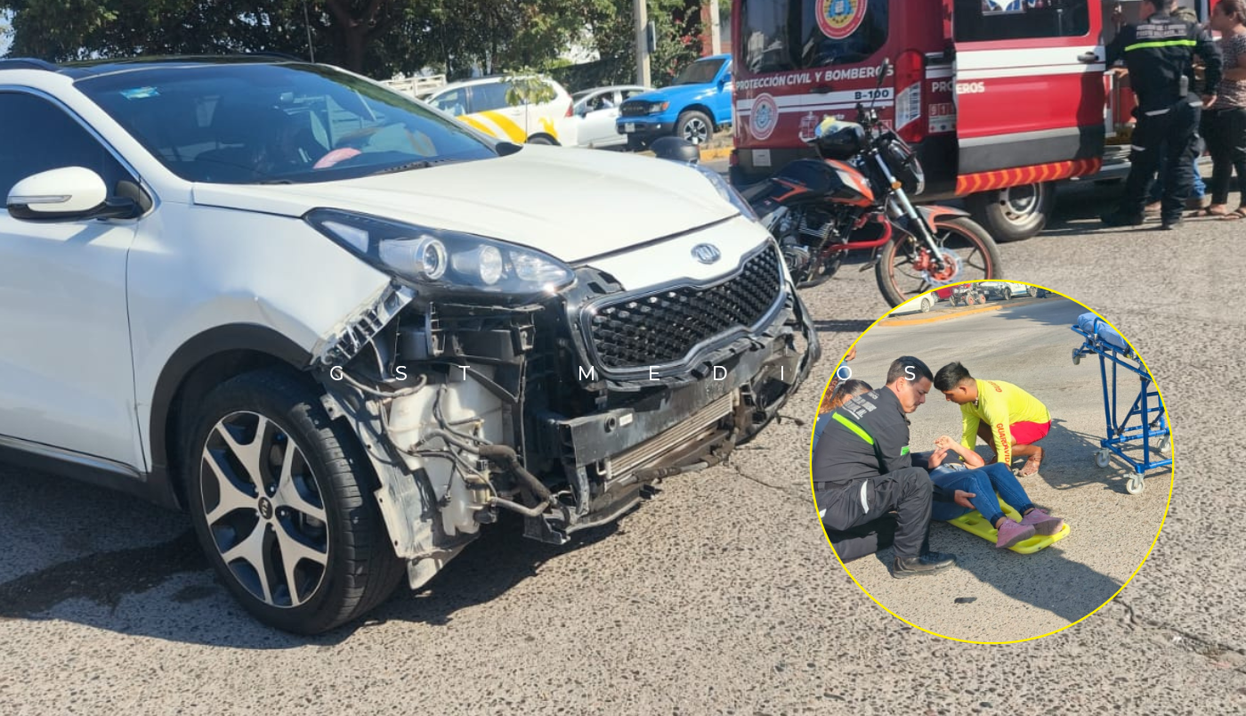 Fue en el cruce de la Av. México y la calle Prisciliano Sánchez que se registró el percance vial, el cual dejó a la acompañante del motociclista con lesiones, por lo que fue trasladada a un hospital.