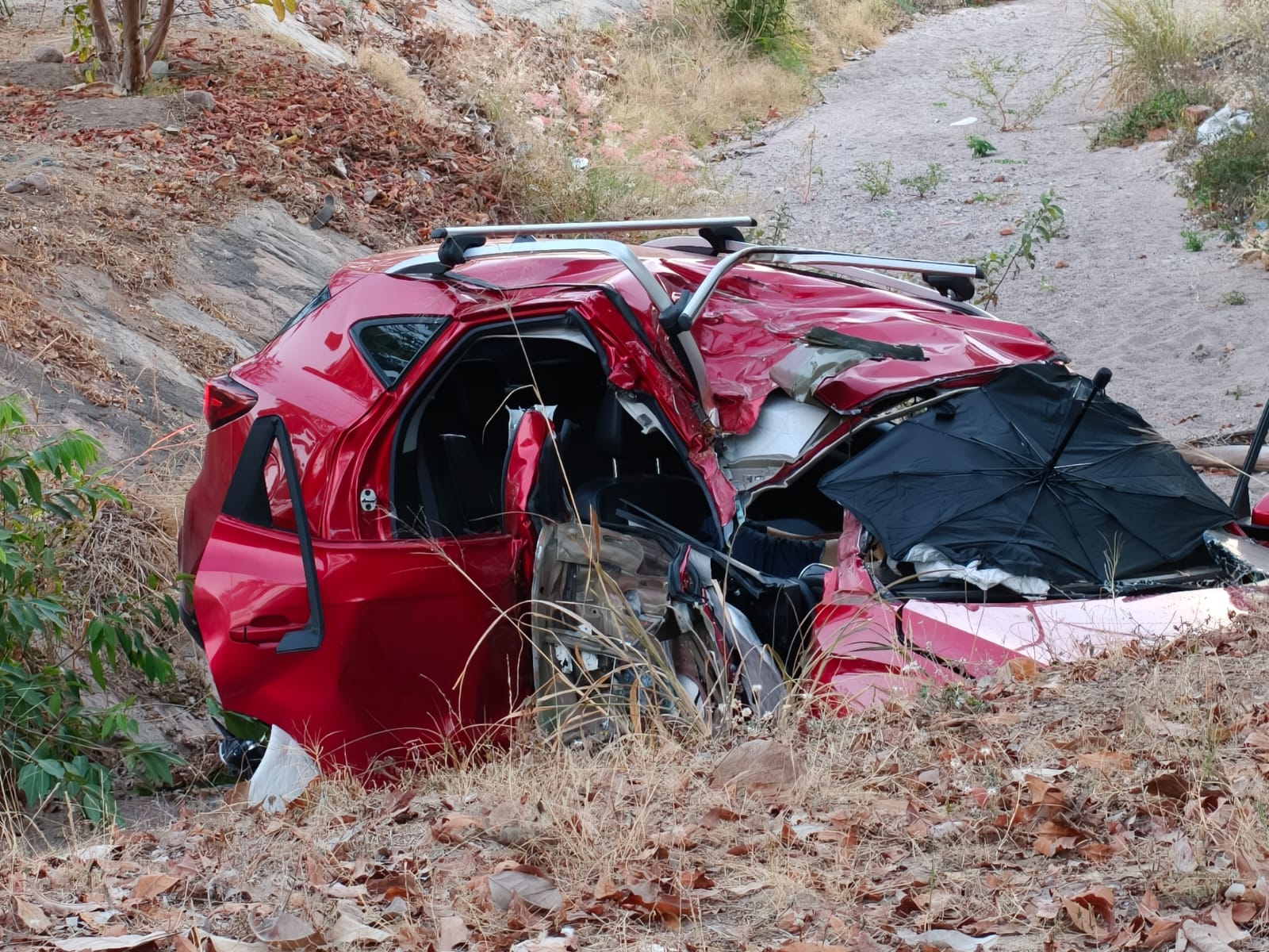 Al intentar girar, el conductor perdió el control de la unidad, impactándose contra un árbol y terminando volcado al interior de un canal. La camioneta quedó completamente destrozada.